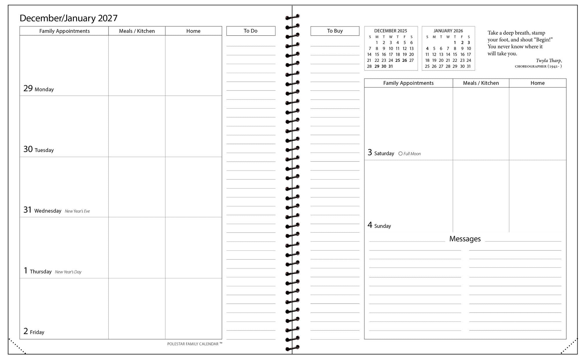 - LISTS—ample space for To-Do and To-Buy lists, family profiles, meal planning, storage records, dates to remember and items loaned and borrowed.